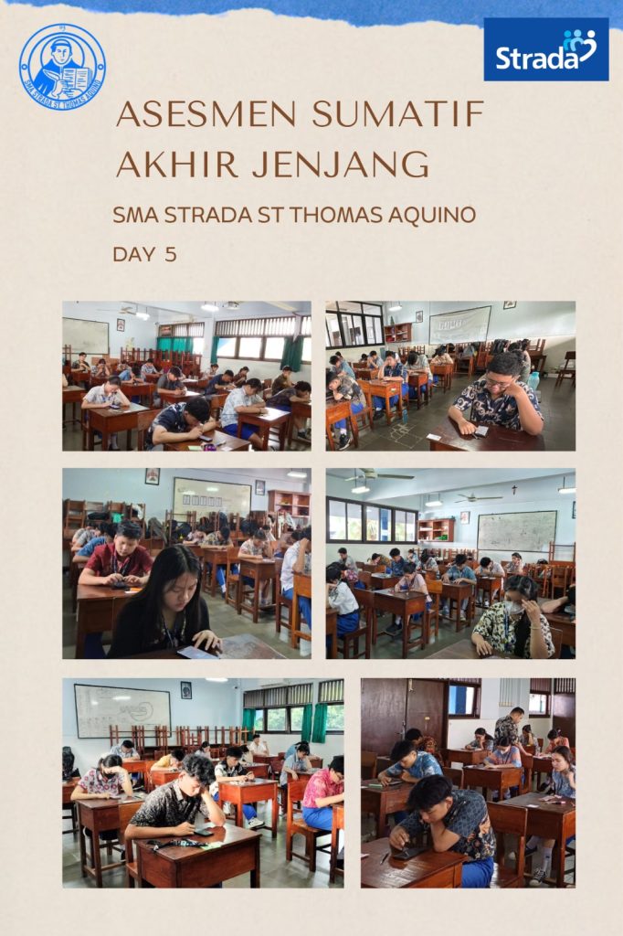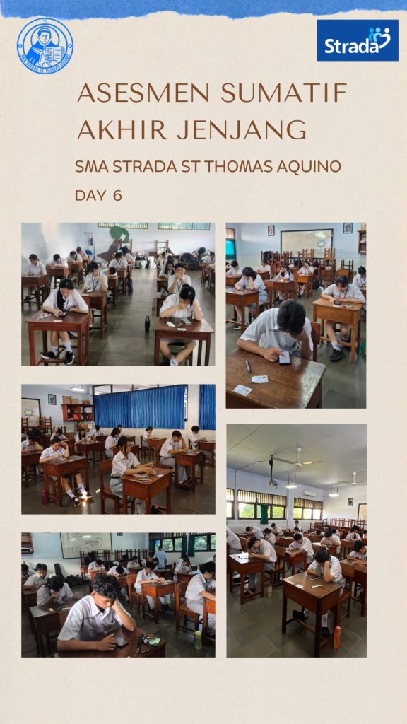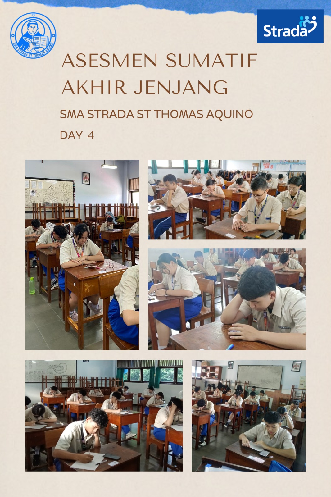 Ujian Satuan Pendidikan atau ASAJ di SMA Strada Santo Thomas Aquino ini sudah berlangsung pada tanggal 9 April 2026 hingga 17 April 2026 dengan jumlah peserta 265 siswa. Pelaksanan ujian kali ini berlangsung di SMA Strada Santo Thomas Aquino Tangerang dengan mengunakan ruang kelas XII dan XI di lantai 3 dan 2 (16 kelas). Selama pelaksanaan ujian anak-anak kelas X dan XI tetap mengikuti pembelajaran secara hybrid (bergantian) dengan tetap menjalankan tugas dan melaksanakan pembelajaran yang diberikan.